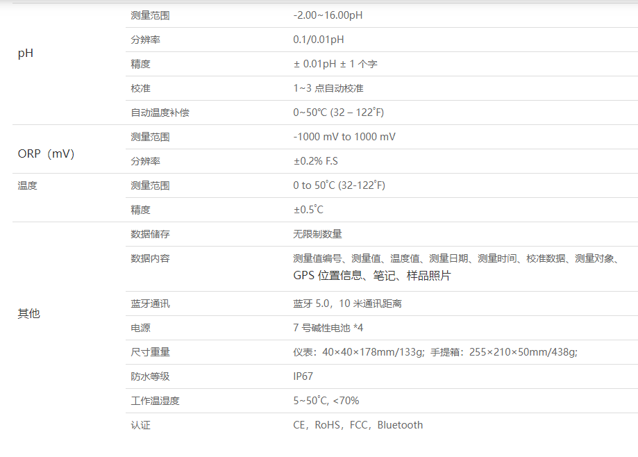 测量范围:-2 to 16.00 pH,0 to 50˚C (32-122˚F);精度:±0.01pH,±0.5˚C